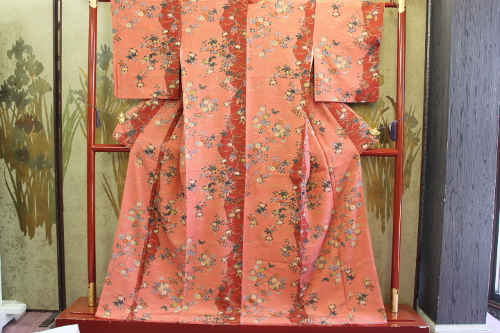 > きもの今昔7188 小紋のきもの 正絹一越ちりめん 広衿袷手縫仕立 菊と橘柄ほぼ画像の色です 身丈151㎝