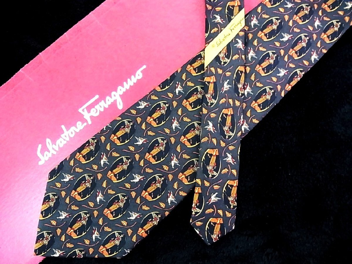 - ♪今週の特売980円~♪2837♪良品【Ferragamo】フェラガモ【男性 鳥 鴨 カモ 葉っぱ 植物 柄】ネクタイ♪