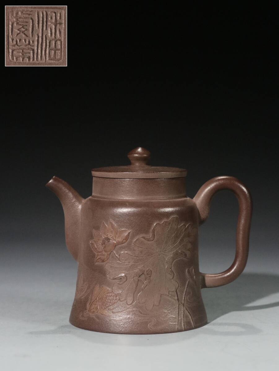- 茶器 紫砂壷「潘虔栄」在銘 朱泥「泥絵平蓋金鐘壺」 急須常滑 茶壷 煎茶道具 唐物時代物 古陶芸 長さ12.6cm,幅8.3cm,高さ10.5cm LB-06265