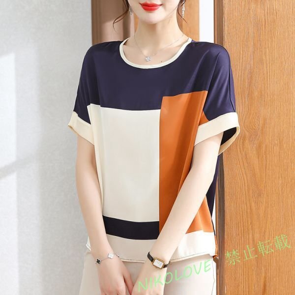 - 新品 トップス 薄手 カジュアル 配色 着回し 半袖 レディース トップス 通勤 着痩せ カットソーネイビー LG995