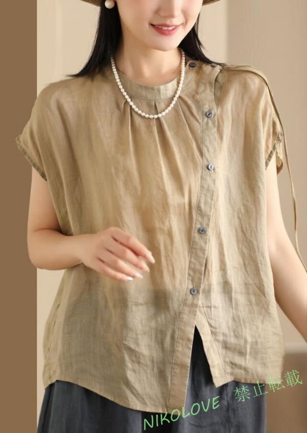 > 新品 ブラウス レディース 半袖 シャツブラウス 綿麻 無地 トップス シンプル ゆったり きれいめ 大人可愛い チュニック カーキ LH036