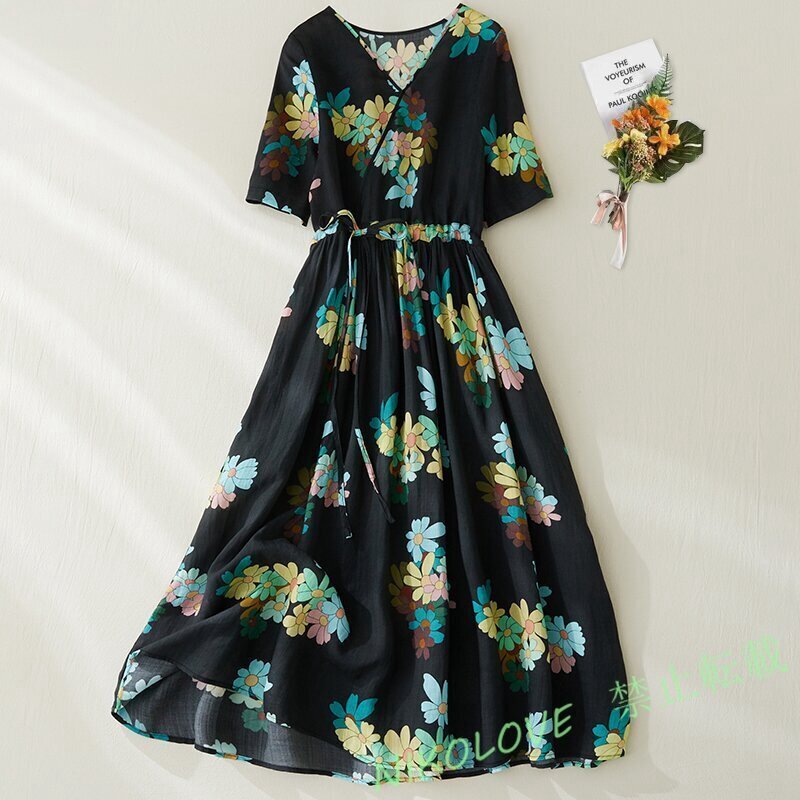 - 新品春夏 カジュアル 大人 花柄 ワンピース Vネック レディース ロングワンピース きれいめ 綿麻 プリント 半袖 マキシワンピース LJ072