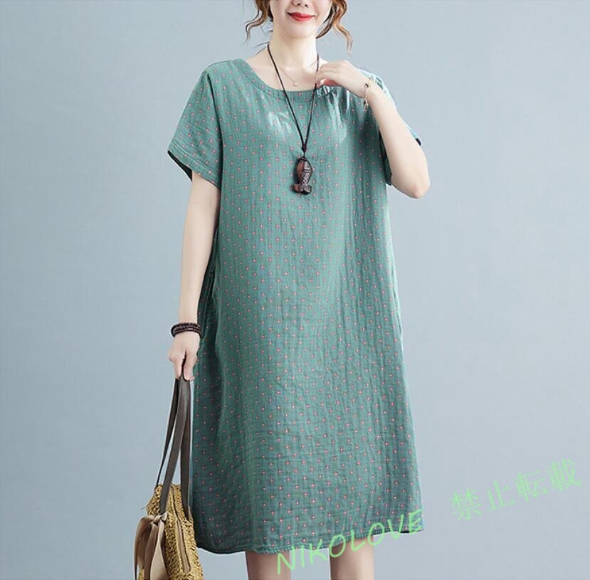 - 新品ワンピース 綿混 レデイース 半袖 ミモレ丈 プリント柄 可愛い 大きいサイズ ロングワンピース 着心地 着痩せ ブルーー XL LJ130