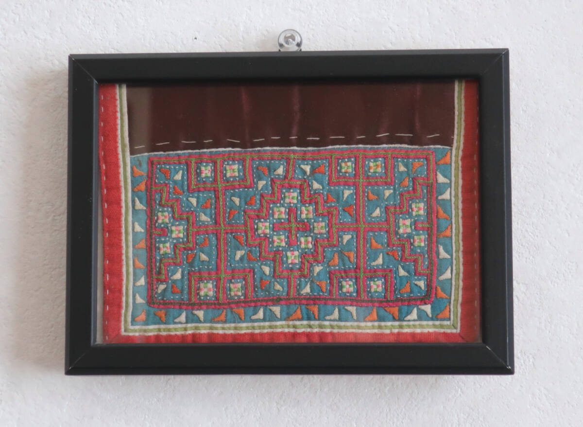 - モン族刺繍 額装 赤x青x黒x白 黒枠 16.5x12x2cm