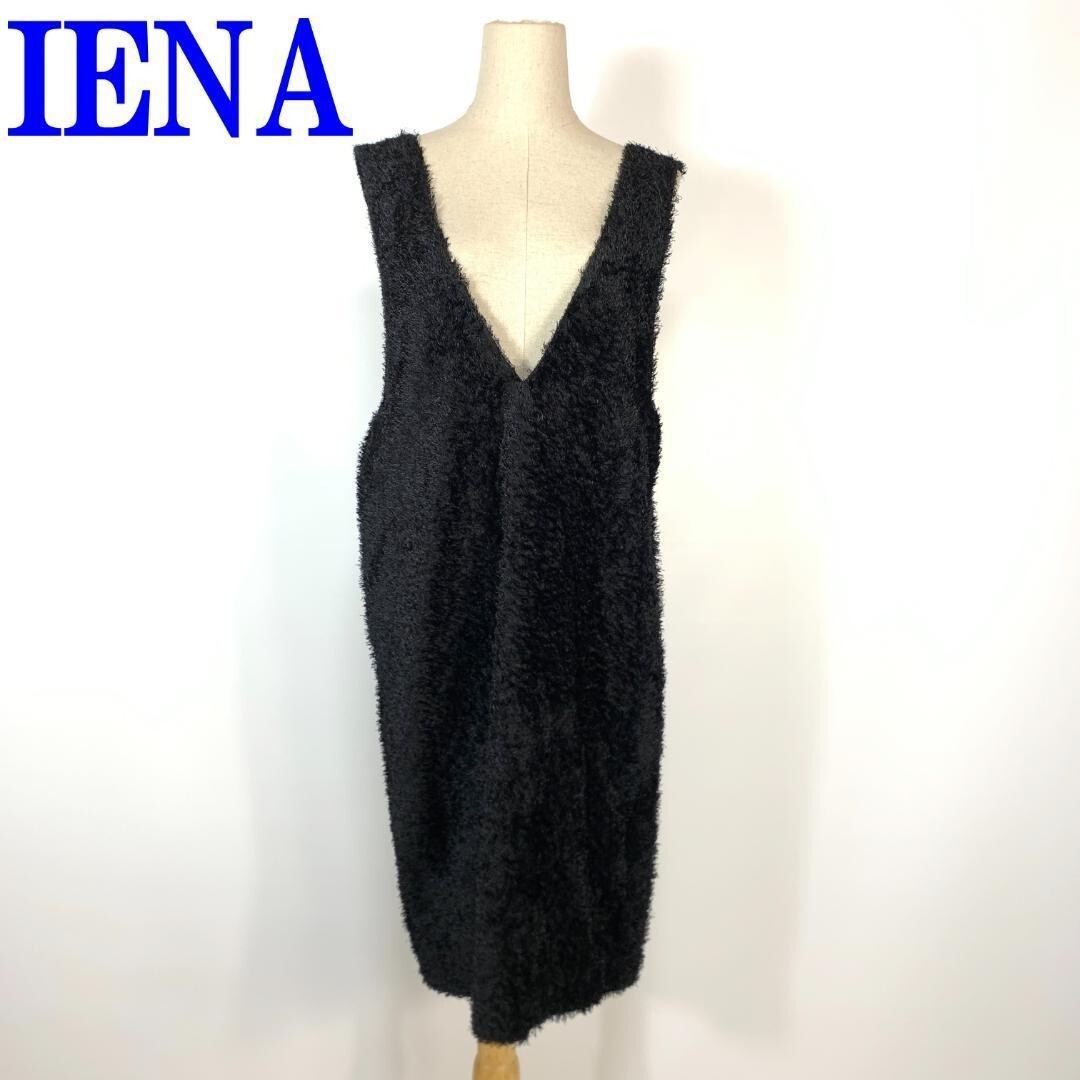 > IENA イエナ シャギーニットVネックワンピースブラックジャンパースカート カジュアル ポケット無 フリンジ ポリエステル100% 38 C579