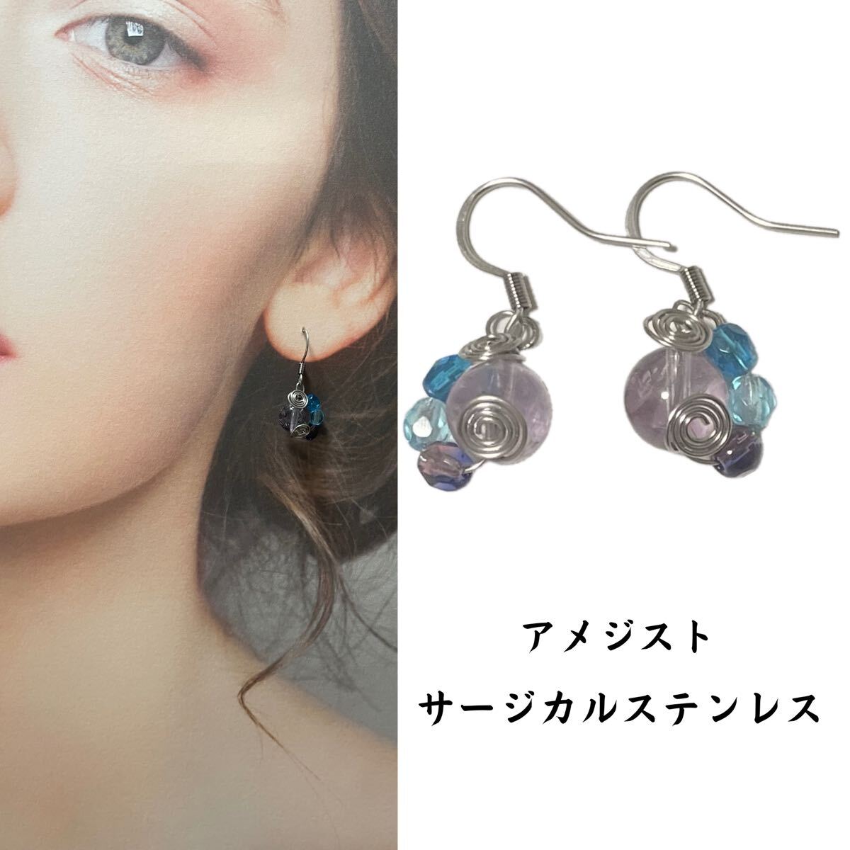 - W110. 天然石 ピアス アメジスト ハンドメイド サージカルステンレス アレルギーフリー ニッケルフリー