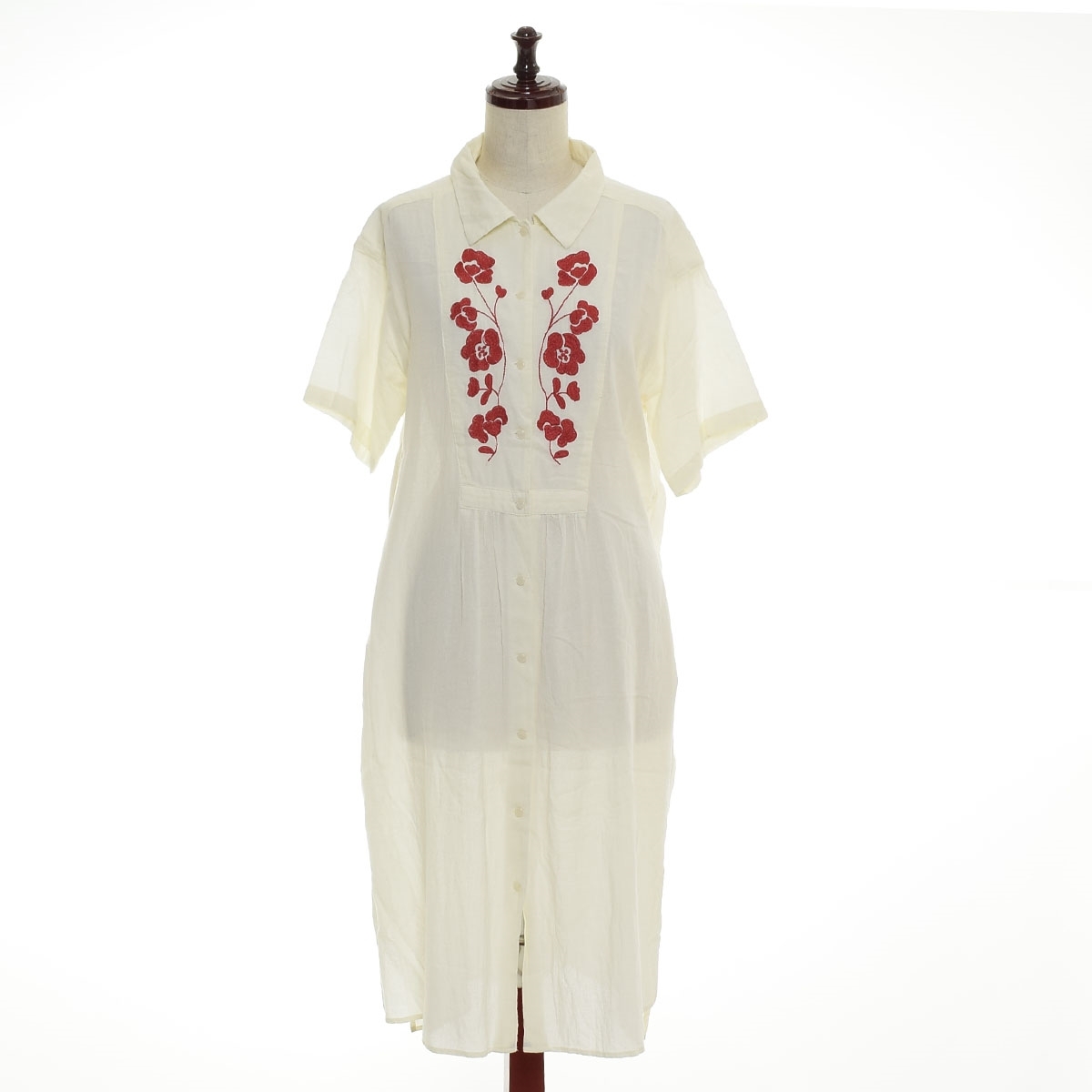 > ■518423 POU DOU DOU プードゥドゥ ●ロングワンピース 花草刺繍ブラウスシャツワンピース サイズM レディース オフホワイト