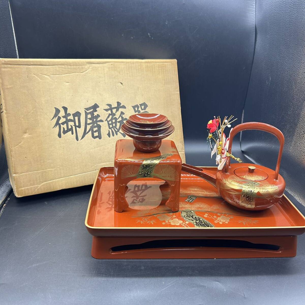 - 屠蘇器 盃台 銚子 盃 屠蘇台 漆器 松竹梅 お正月 酒器 朱塗 金彩 お屠蘇セット カ21