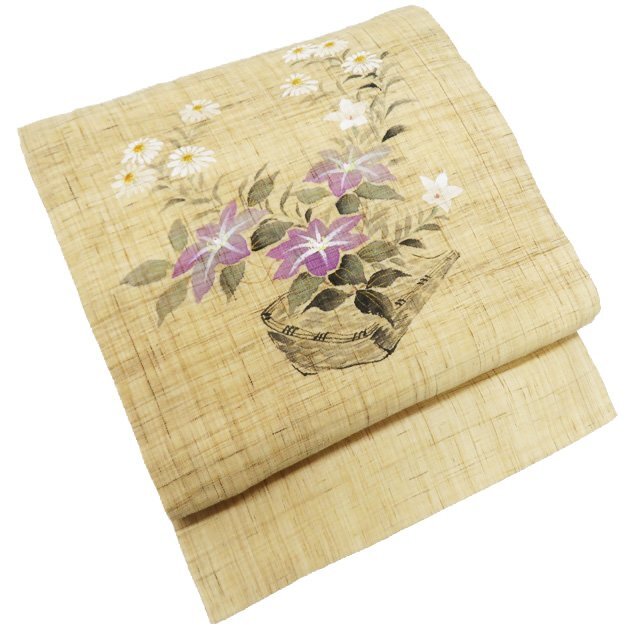 - 夏物 名古屋帯 なごや帯 中古 麻 カジュアル 仕立て上がり 作家物 落款 花の図 秋草 枯草色 多色 きもの北條 A1067-7