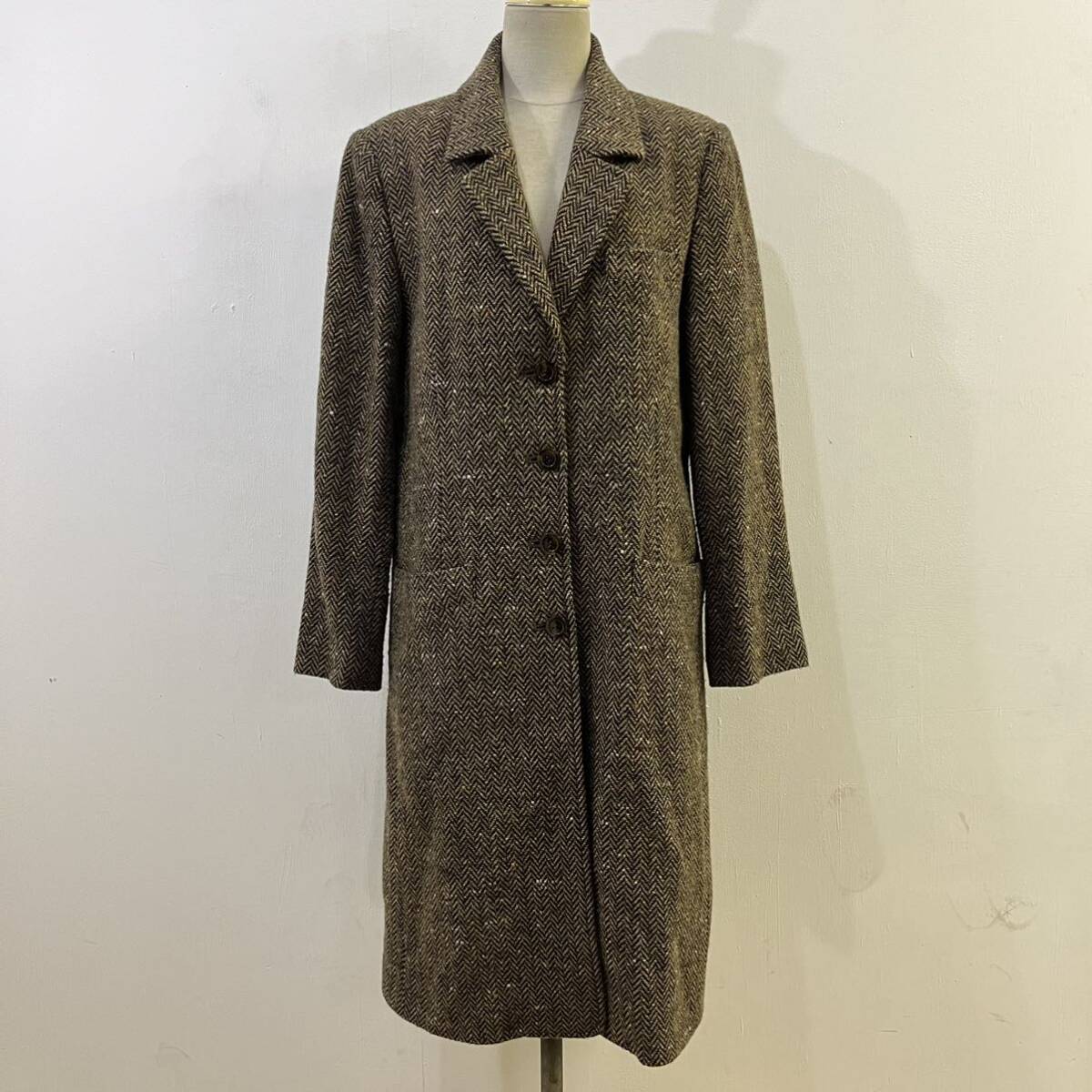 - 80s VINTAGE RYKIEL INSCRIPTION ロングコート ウールコート チェスターコート ヘリンボーン柄 リキエル ビンテージ【送料一律/同梱可能】E