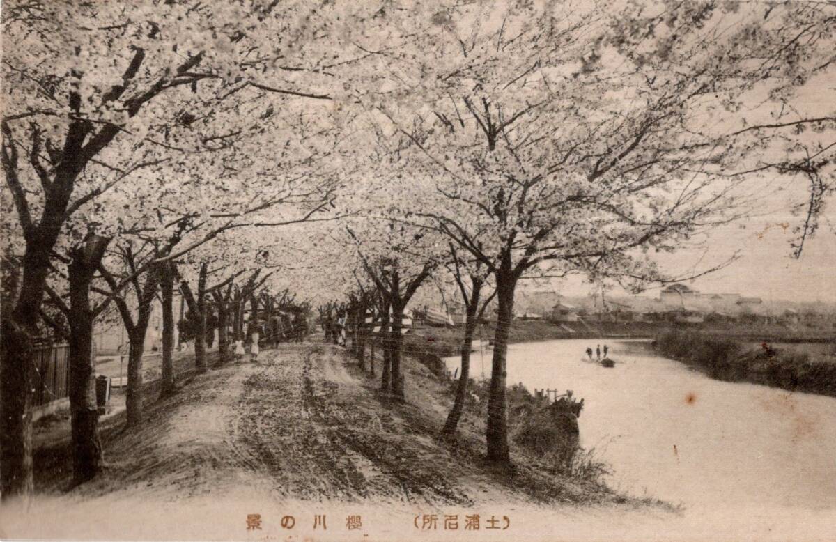 - 絵葉書 土浦名所 桜川の景 桜花河川小舟等 茨城県土浦市観光名所絵はがき 難アリ
