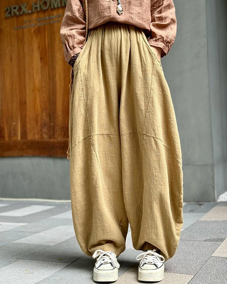 > 新入荷* 秋新作 カジュアル 綿麻 ガウチョパンツ ボトムス ワイドパンツ ロング丈 ウエストゴム ゆったり 大きいサイズ パンツ*イェロー