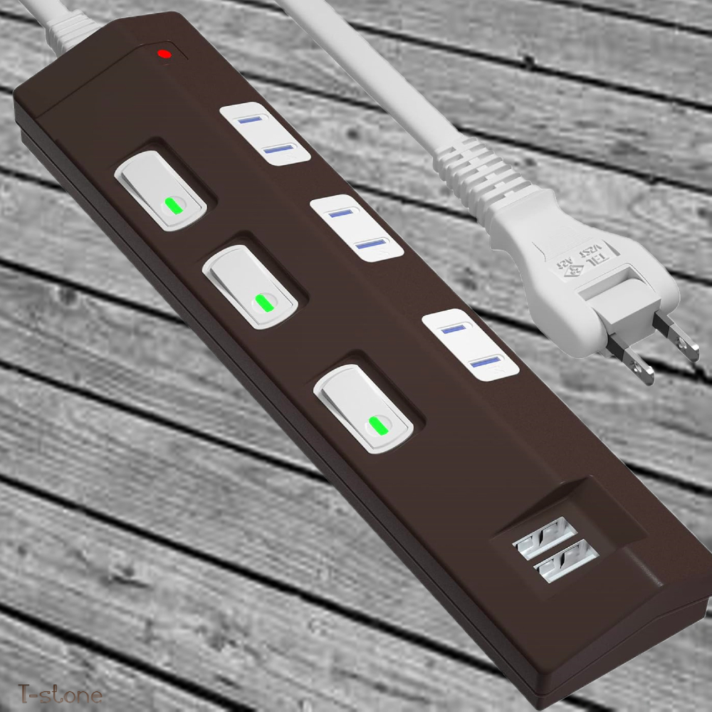- 電源タップ 延長コード 山形 ブラウン 1M 個別スイッチ USBポート お洒落 省エネ節電 コンセント 世界電圧対応 雷ガード シック インテリア