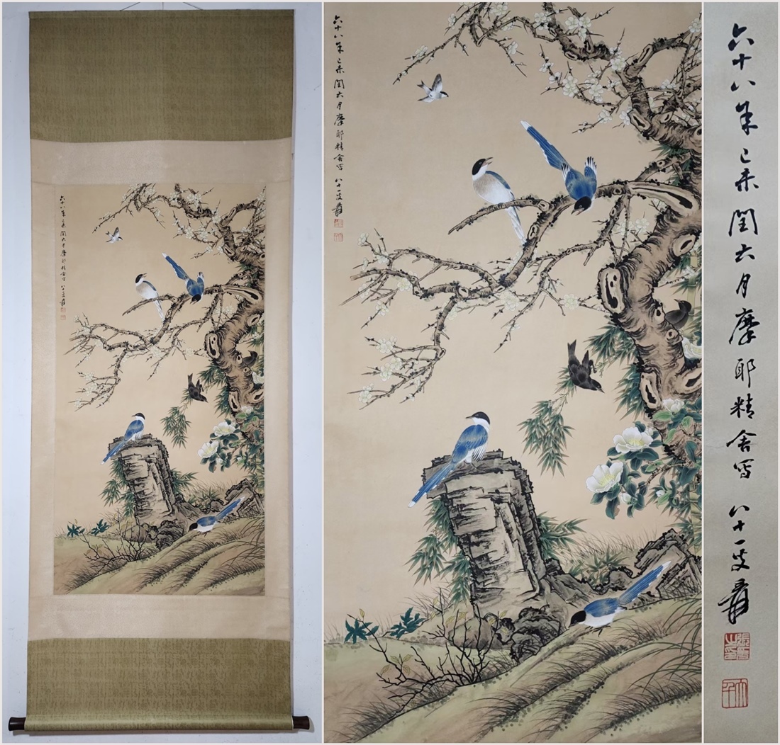 > 古美術 掛け軸 中国・近現代 「張大千書」 紙本 【花鳥図】 立軸 書道 巻き物 真筆逸品 肉筆保証 唐物 古画 LT-2408209