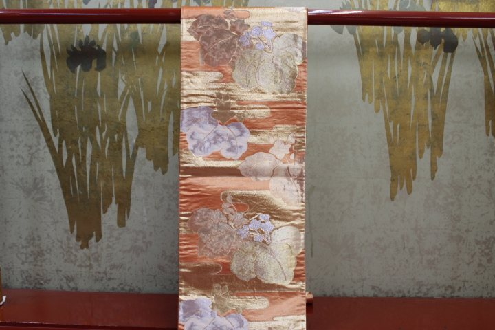 - きもの今昔7456 袋帯 西陣織正絹 橙色地金引箔 瑞雲に桐の花金箔織 画像の様に金箔が美しい 帯の長さ410cm