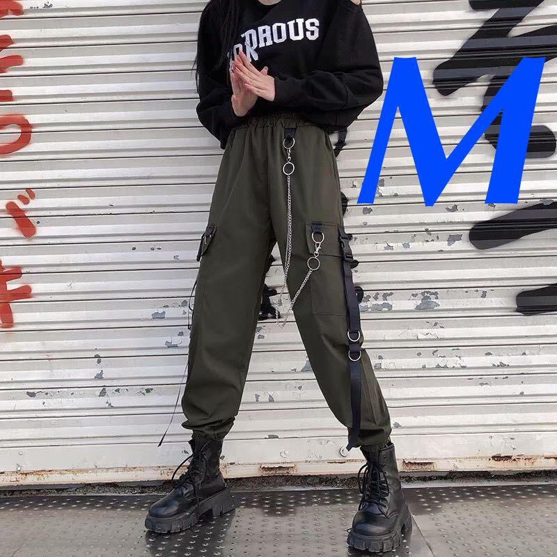 - ジョガーパンツ テーパードパンツ チェーン ストリート カーゴパンツ ユニセックス 男女兼用 カーキ 緑 M