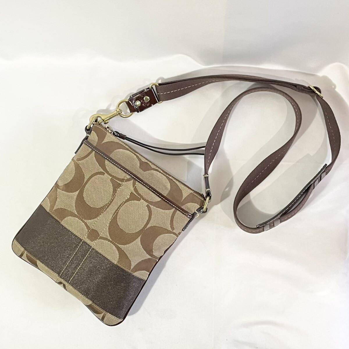 - 【美品】 正規品 コーチ ショルダーバッグ シグネチャー サコッシュ ポシェット 鞄 COACH キャンバス レザー 革 ブラウン 茶色 ベージュ