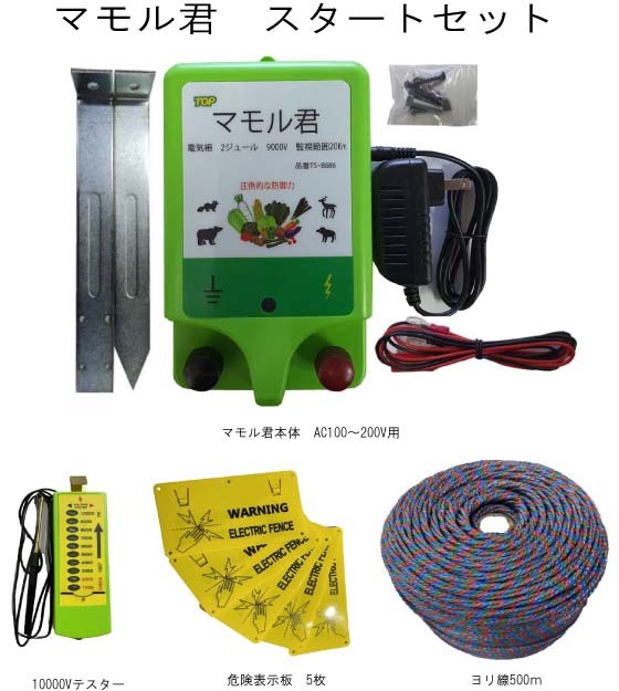> 電気柵電源 マモル君 AC100~200V入力タイプ マモル君本体・ヨリ線・警告表示板・テスターセット 出力9000V 監視範囲20KmTS-8686 2ジュール
