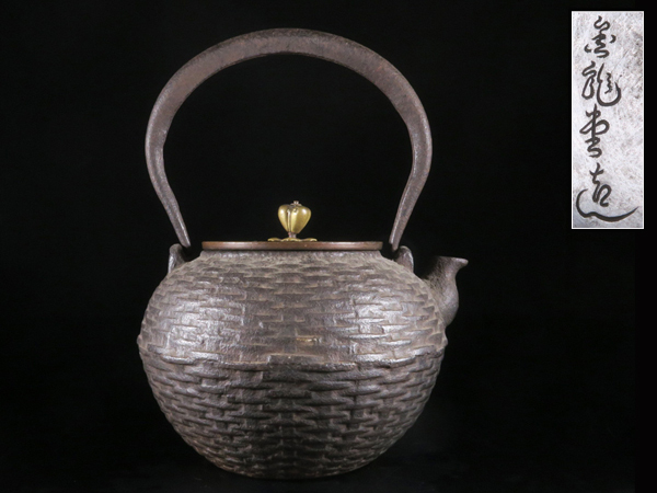 - 魁◆旧家蔵出し 時代物 雲龍堂 宝珠形 網代網文様 銅蓋鉄瓶 煎茶道具