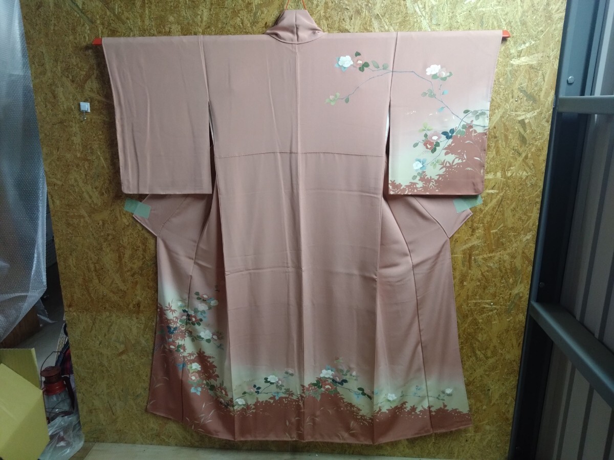 - ● 11 仕付け糸付 未使用品 桃色 くすみカラー 金 銀 彩 正絹 着物 枝葉 花模様 椿 入学 卒業 結婚 式 お宮参 七五三 訪問着 ①