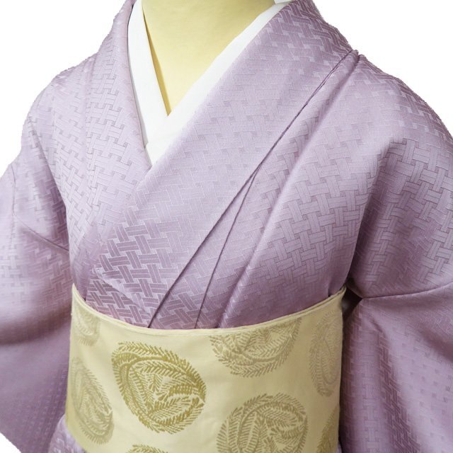 - 色無地 着物 中古 正絹 袷 フォーマル 紋付き 地模様 大籠目文 淡紅藤色 身丈154cm 裄63cm SA きもの北條 A1082-2