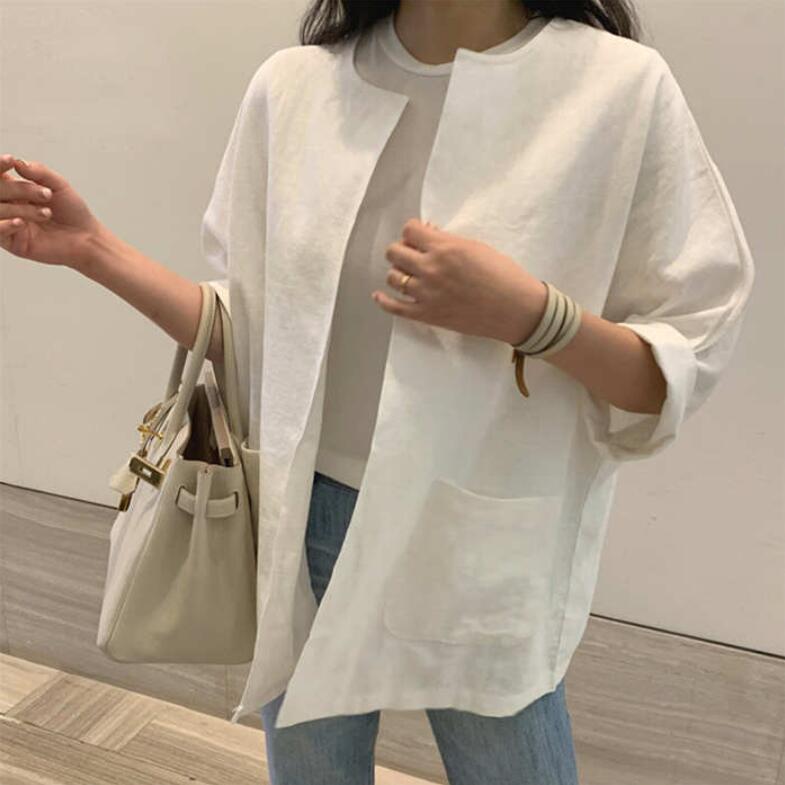 - 秋新品*ジャケット 薄コート 綿麻調 長袖 レディースアウター トップス 羽織り ショート カジュアル リネン風スーツ ビジネス通勤*ホワイト