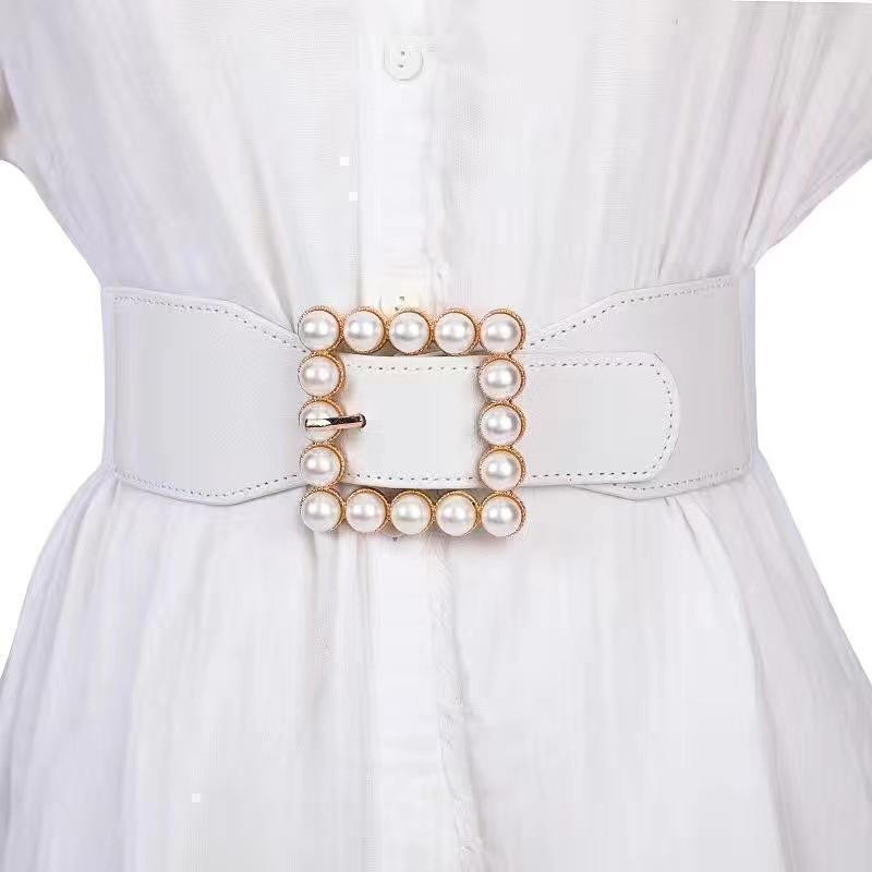 - 【ホワイト】ホワイトパール ゴールドバックル 幅広ゴムベルト