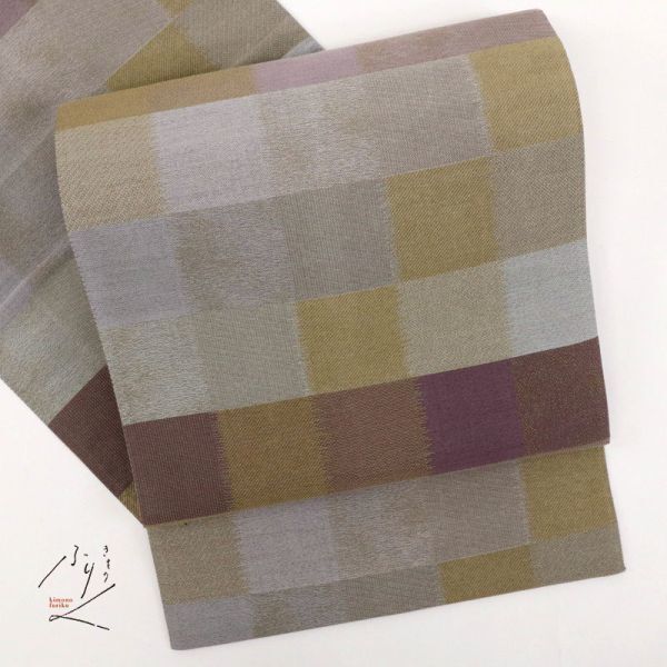 - 【袋帯】 かすれ格子タイルチェック 紫葡萄鼠グレー多色 正絹 着物 FP12-2