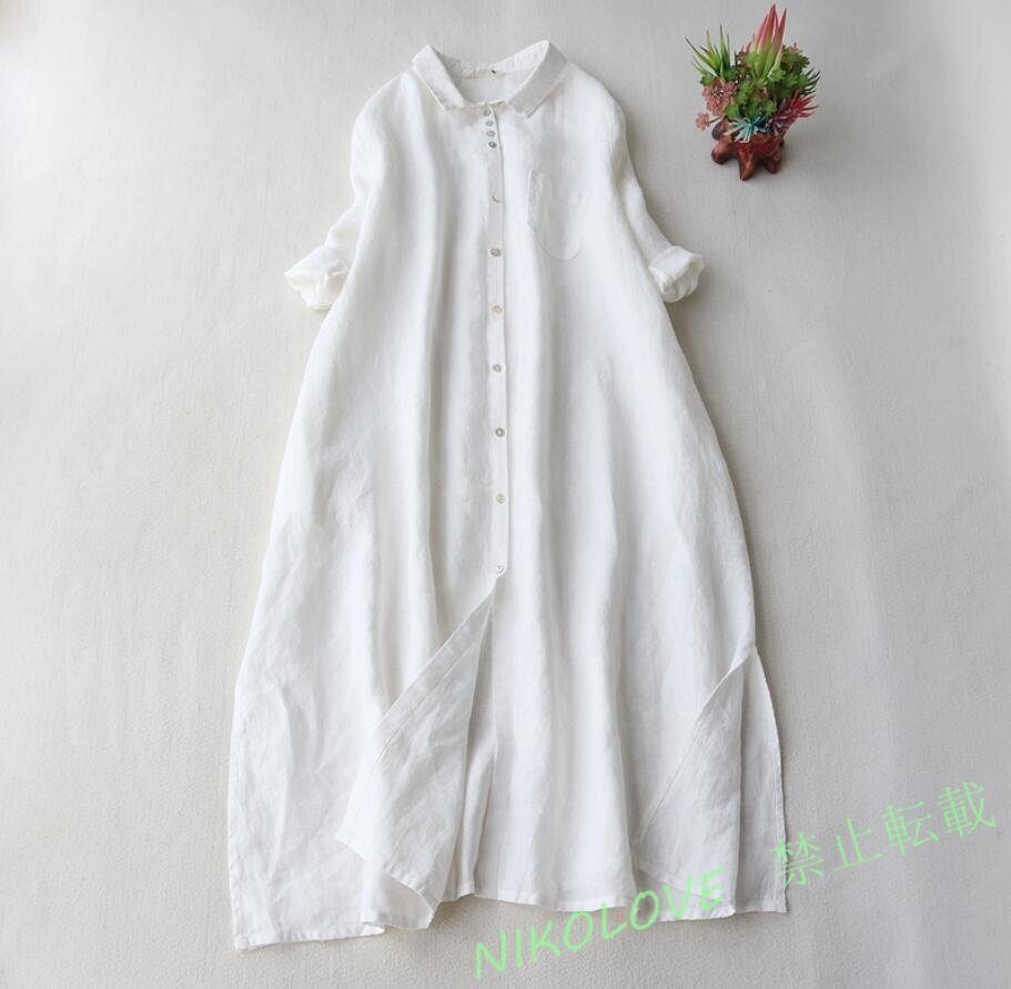 - 新品春夏ワンピース 半袖 きれいめ リネン ロングワンピース 大きめサイズ上品 通勤 オフィス ロング丈ワンピース ホワイト LH605