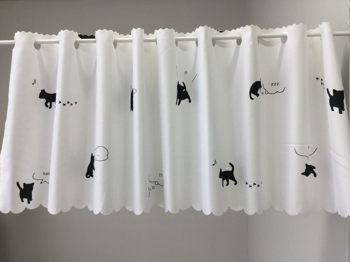 - 防炎カフェカーテン140cm巾X220cm丈ホワイト生地にクロネコ 間仕切り 断熱 保温 UVカット 防視性 遮断 洗濯可能 エコ素材 厚手 juuku