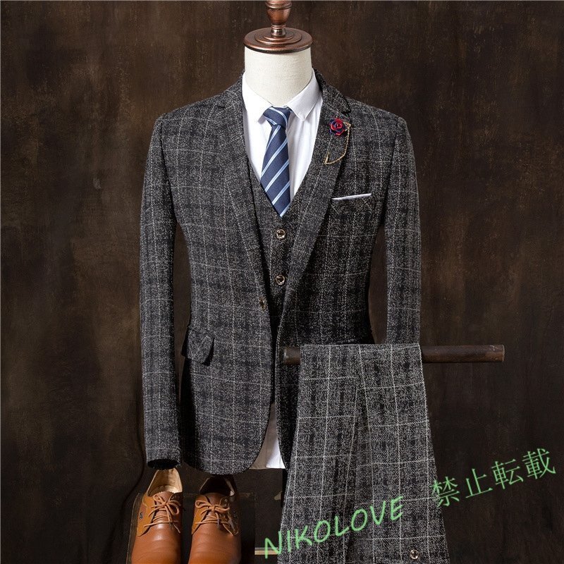 - 新品 最高級 スリーピーススーツ チェック柄 3点セット ビジネススーツ ベスト ブレザー パンツ フォーマル 就職 結婚式 濃灰色 LH366