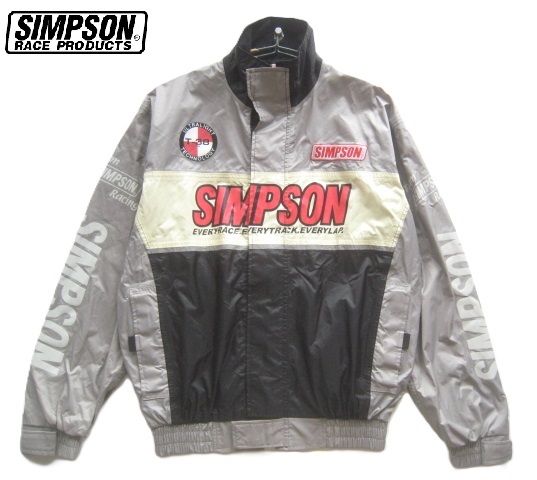 - 高級!!シンプソン SIMPSON*ロゴプリント メッシュ裏地 立ち襟ナイロンZIPジャケット M 灰×黒×白 バイク レーシング バイカー