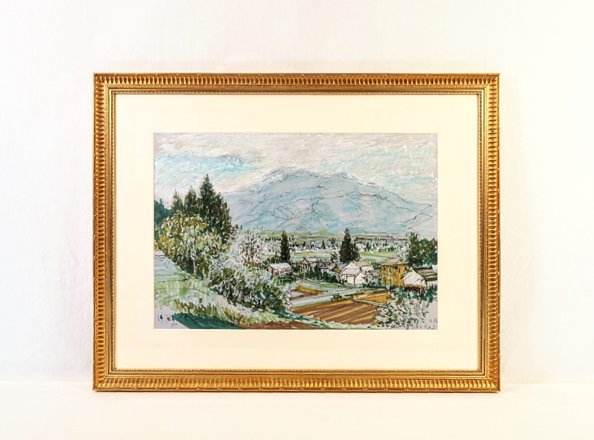 - 真作保証 嶋津俊則 2004年パステル+ペン「白馬」画寸 53×36cm 大阪府出身 二元会名誉会長 奥深い山村集落と北アルプスを望む晩春風景 9652