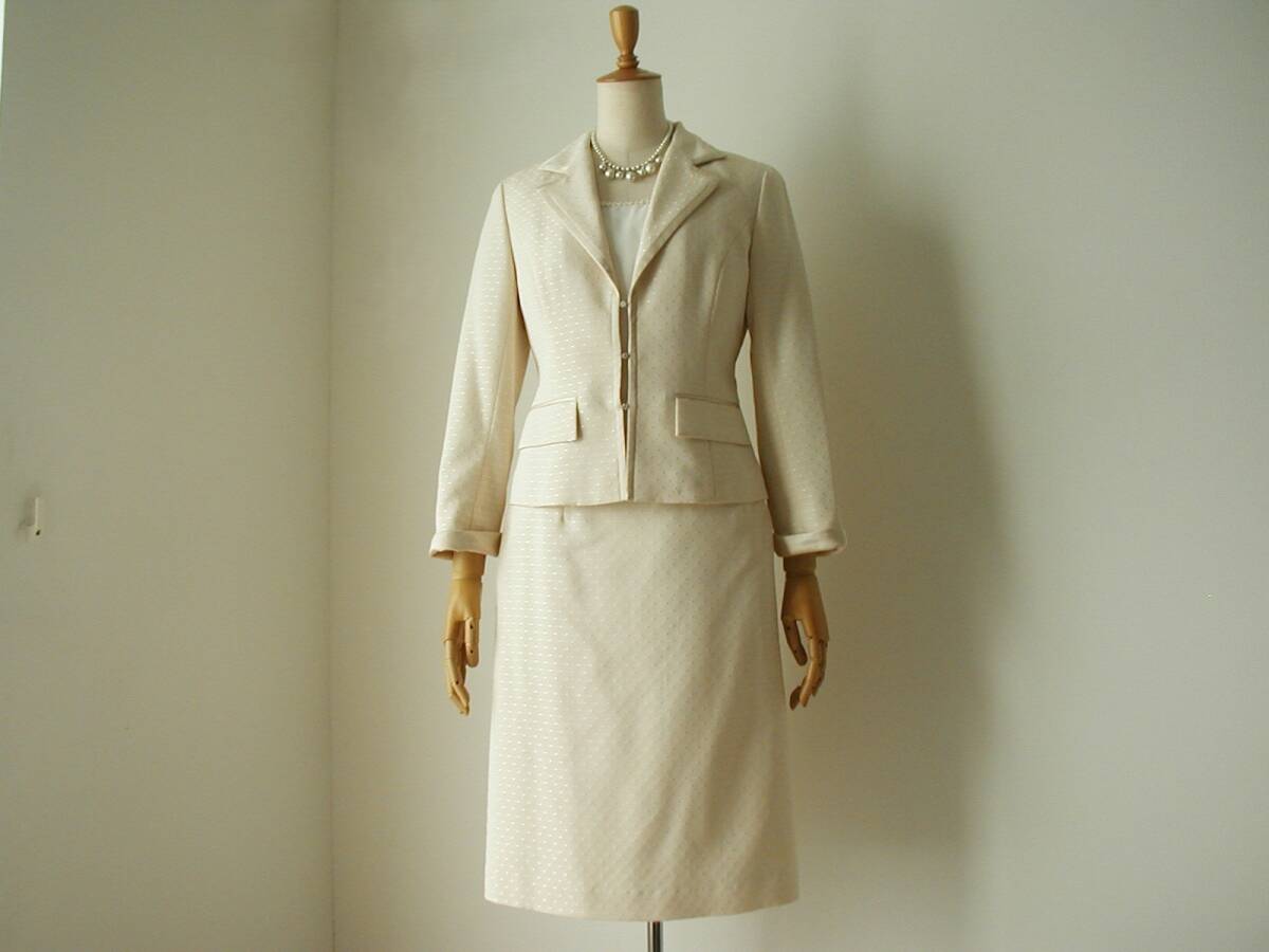 - クレージュのスーツ★サイズ38.40★ベージュ/ドット刺繍/セットアップ/ジャケット/スカート/イトキン/入学式/ラインストーン