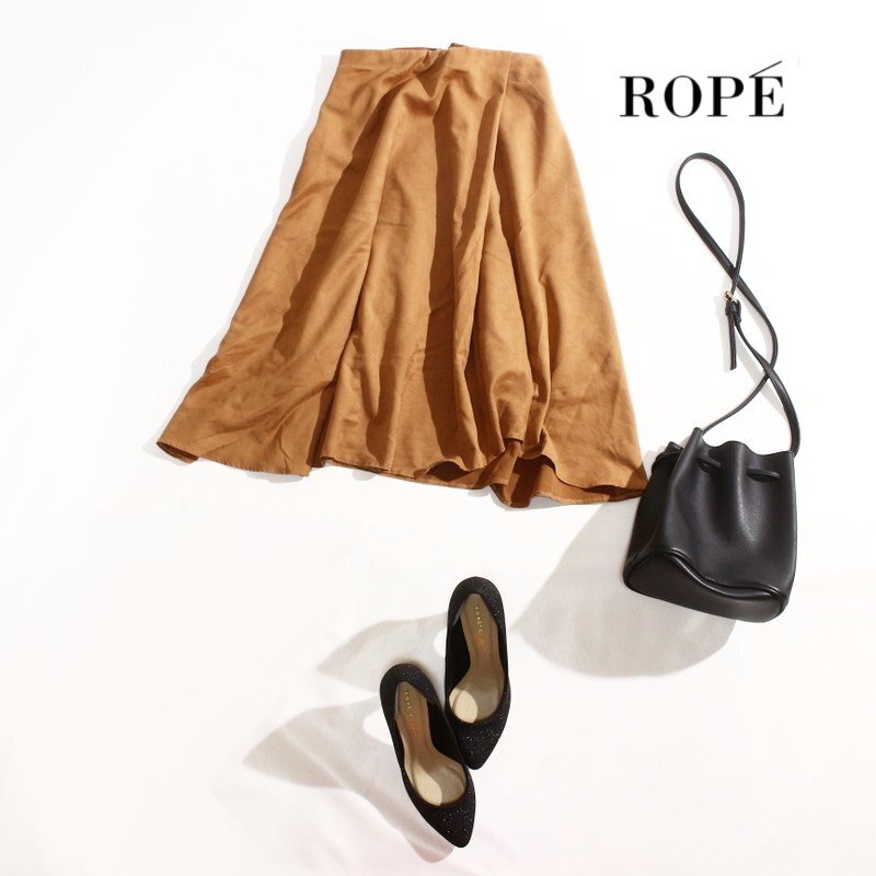 > 美品 ROPE’ ロペ 秋 冬 上品 スエード ひざ下 ミモレ丈 フレアスカート Aライン レザースカート 7号 36 キャメル ブラウン ロング