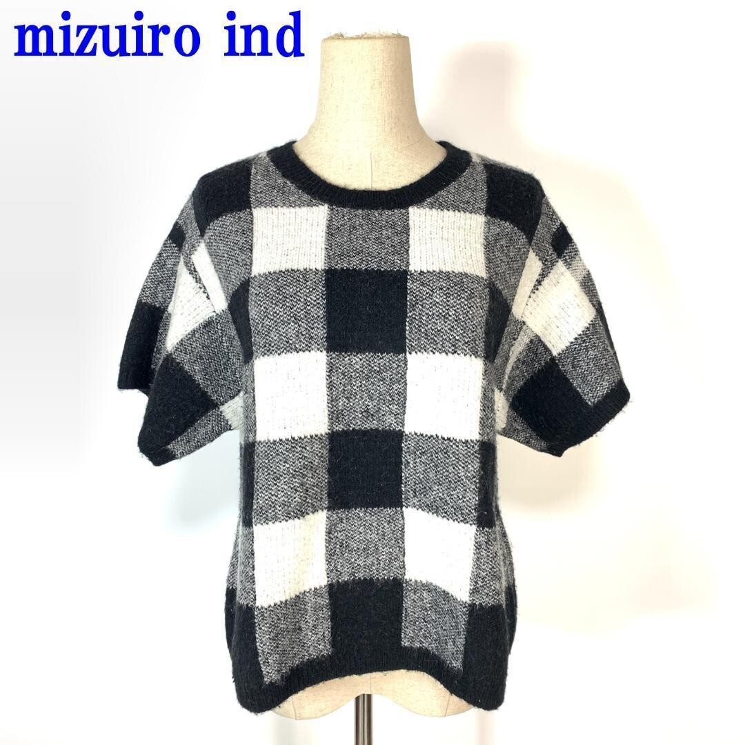 - ミズイロインド 半袖ニット セーター ウール チェックmizuiro ind ブラック ホワイト 黒 白 F C1436
