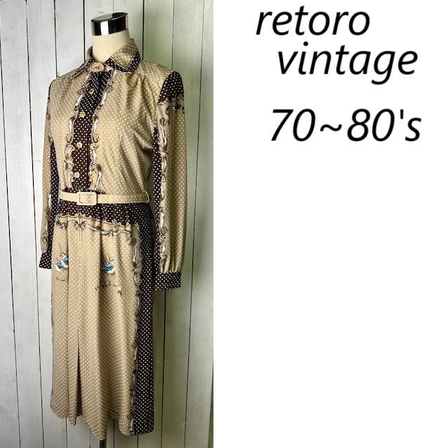 > 昭和レトロ古着 70s~80s ベルト付 総柄ロングワンピース 13 M~L カフェオレ オールド ヴィンテージ レトロモダン 長袖 国産 ★242