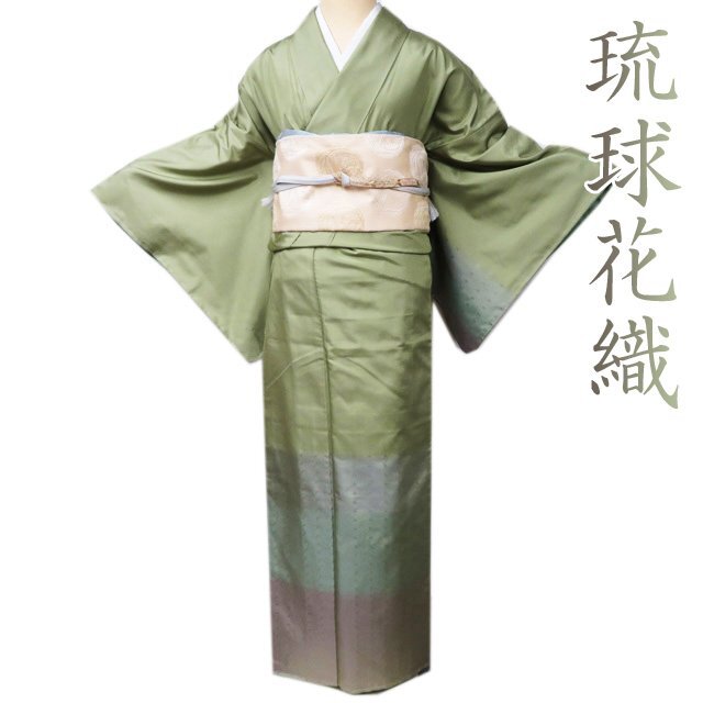 > 特選 琉球 花織 着物 中古 正絹 紬地 袷 セミフォーマル 淡萌黄色 多色 身丈158cm 裄66.5cm M きもの北條 A1094-9