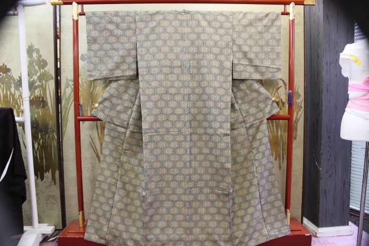 > きもの今昔7672 紬のきもの 袷広衿手縫い仕立きもの 正絹紬地ベージュ色大島調亀甲に華文柄 身丈161cm
