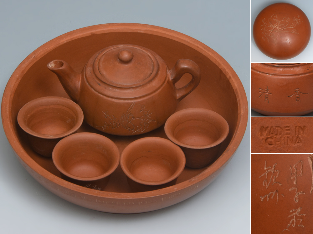 - 中国美術 中国欽州窯 朱泥 紫砂 泥興陶 香清梅鶯紋 花鳥図刻 茶器 急須 煎茶碗4客 甲子於欽州 古陶磁器 煎茶道具 蓋物 唐物 古玩 z8435o
