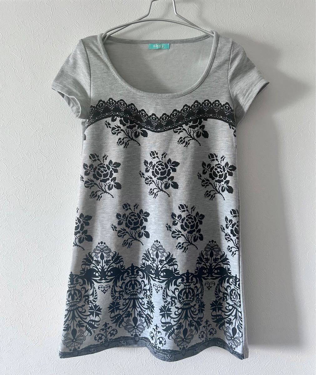 - titty&Co 花柄プリント ビスチェ柄 半袖 カットソー チュニック ロング丈 グレー Tシャツ