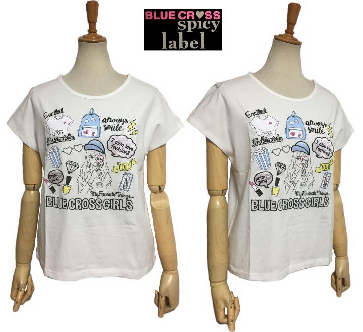 > 送料185円 BLUE CROSS spicy label フレンチスリーブ プリントTシャツ 肩開き 白 160cm