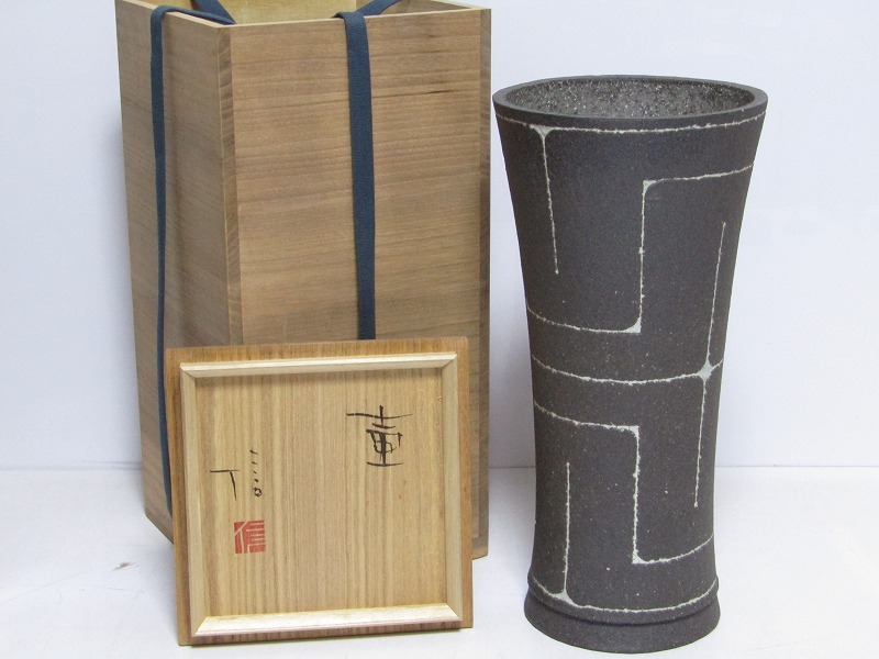 - 伊藤信 益子焼 壷 高さ34cm 共箱 花瓶 花器 飾壷 JK22-9537[TOM]