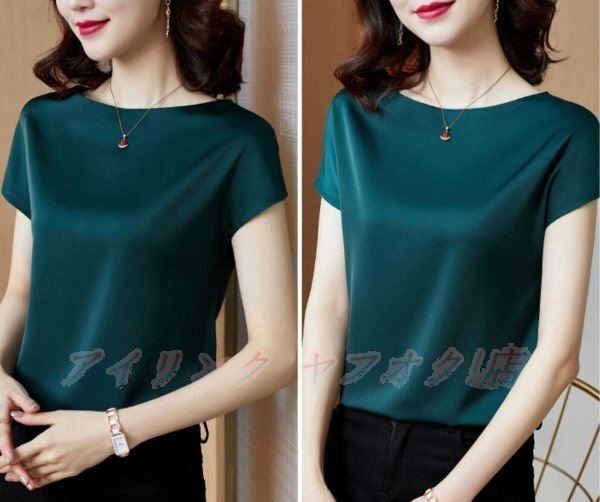 > ☆新品サイズ選択可 夏エレガント つるつる サテン素材 優雅 通勤 大人 半袖 ドルマン袖 ブラウスシャツ トップス*緑