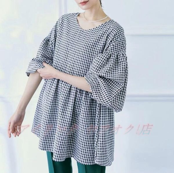 - ☆新品秋 ブラウス シャツ トップス ふんわり袖 チェック柄 カジュアル 大きめ オフィス 通学通勤 可愛い 大人 ブラック