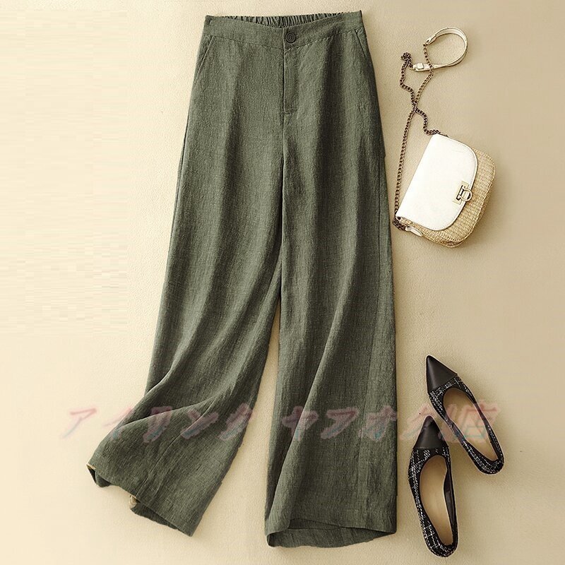 - ☆新品カジュアル ゆったり ボトムス ワイドパンツ レディース パンツ パンツ ウエストゴム 素敵な リネンパンツ グリーン