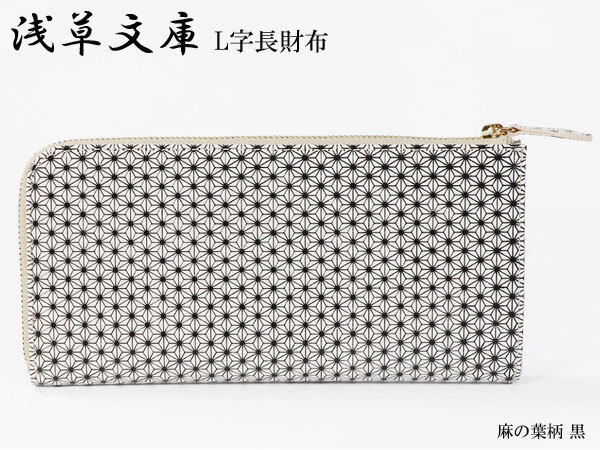 - 財布 L字長財布 麻の葉柄 長財布 浅草文庫 黒 小銭入れあり 日本製 友禅染 本革 江戸小紋 いろどりシリーズ レディース メンズ