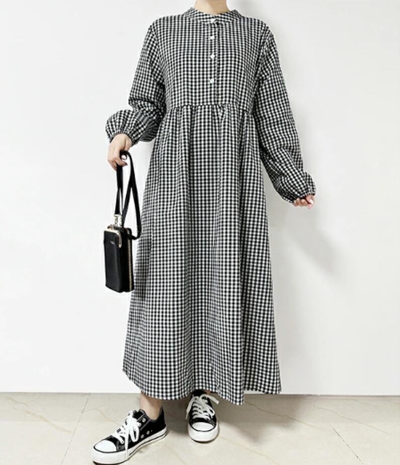 - 秋新作/ワンピース シャツワンピース チェック柄 長袖 ロング丈ワンピース 総柄 大人 カジュアル 大きいサイズ 着痩せ ロングワンピース/黒