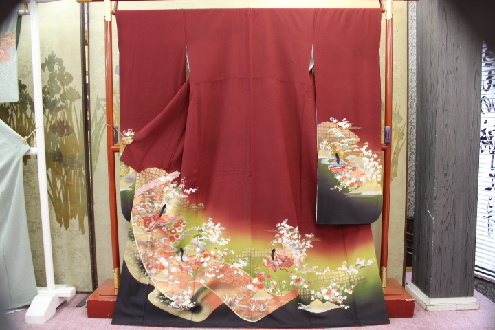 - きもの今昔7708 ふりそで 正絹一越ちりめん地 源氏物語風情景 エンジ赤地友禅染を挟み裾は黒色 身丈170cm