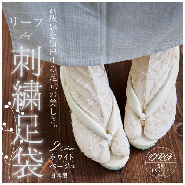 - 【オリジナル商品 リーフ刺繍足袋】 『ホワイト』 『23.5cm』 ミツビシ足袋 4枚コハゼ 刺しゅう レース 和装小物